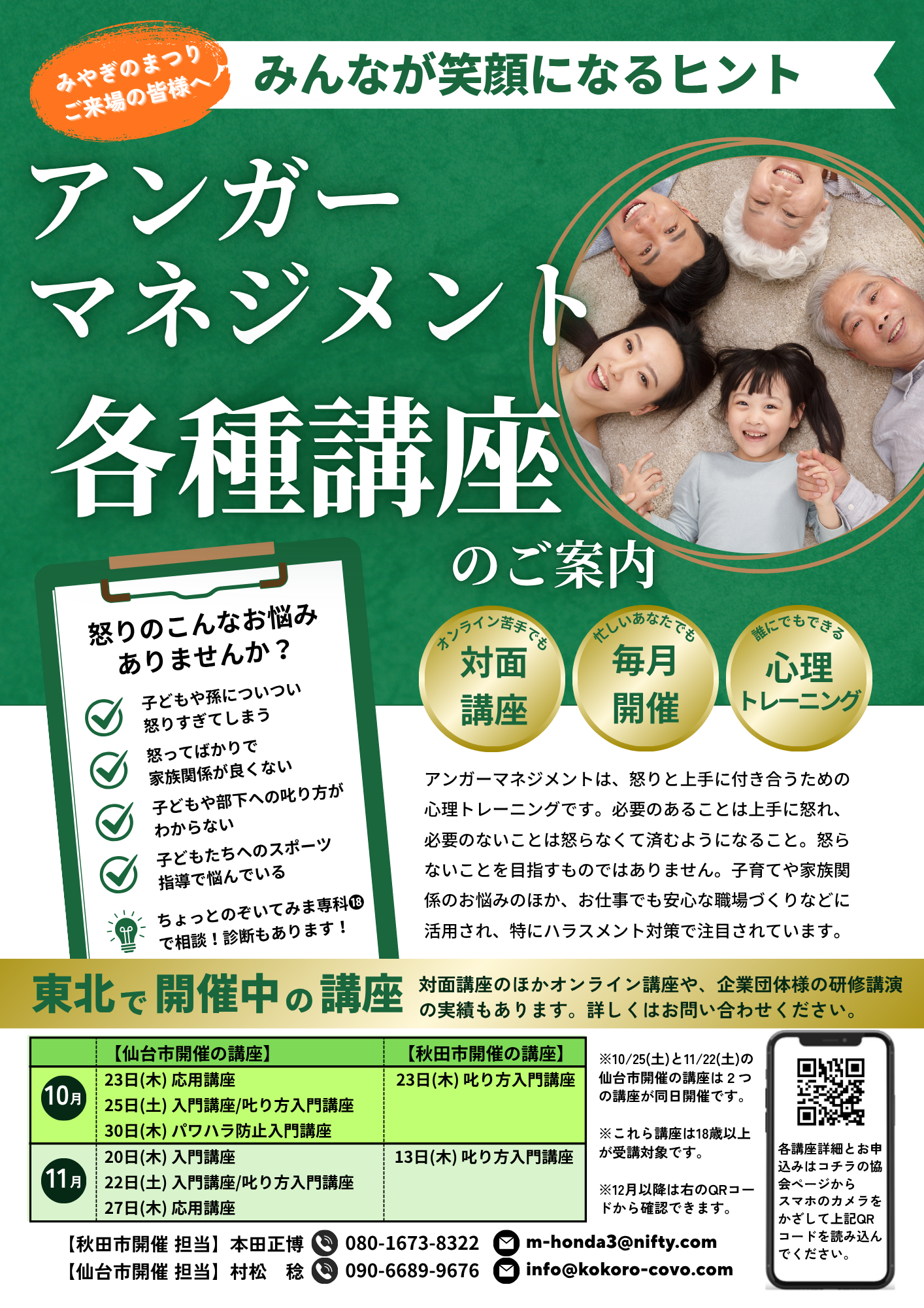 アンガーマネジメント診断のほか、キッズワークの体験を行う予定です。